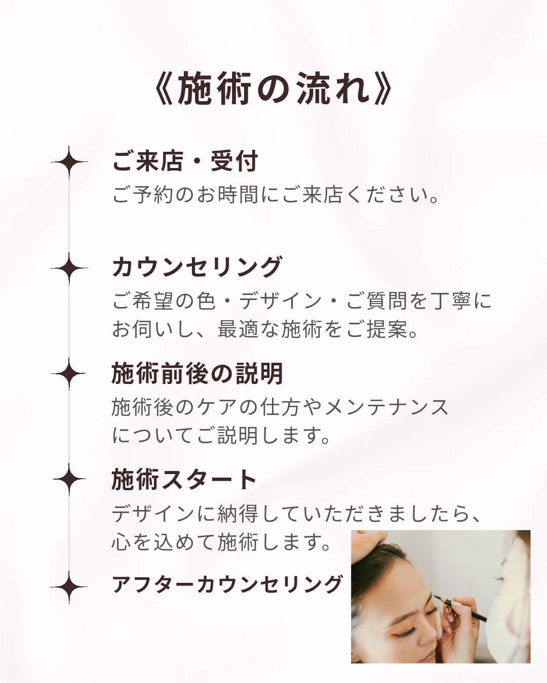 ※初回のお客様は1回目の後1ヶ月〜2ヶ月以内にデザインとお色調整のため、2回目のご来店をお願いします。