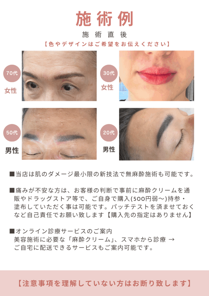 ※当店は一般社団法人日本コスメティックタトゥー協会に所属しておりコスメティックティックタトゥーとして施術しております。タトゥーは医療行為ではないと正式に判決が出ております。不安や心配な方はクリニックでの施術をお勧め致します。